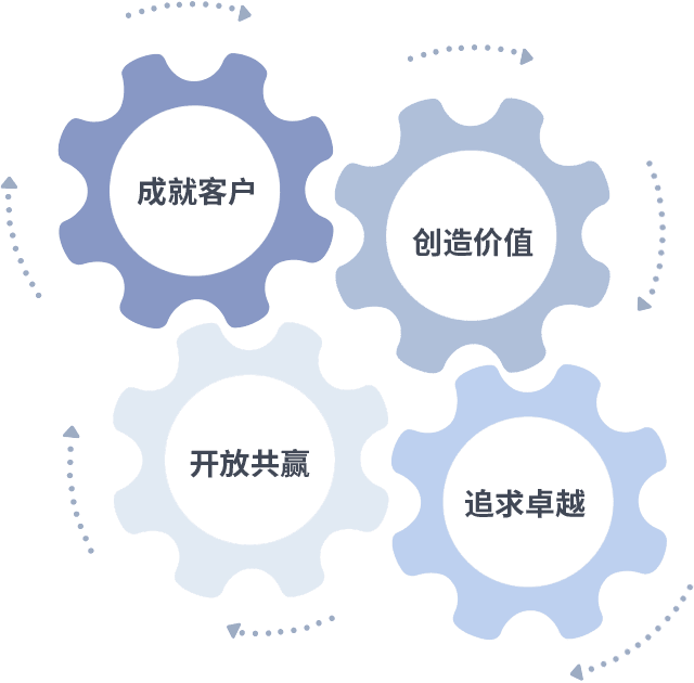 成就客户是一切决策的出发点,,,创造价值是衡量所有工作的标准,,追求卓越是我们做事做人的态度,,开放共赢是我们的格局也是最终的结果。。。价值观的齿轮环环相扣,,,,推动着组织里的每个人不断向前。。。